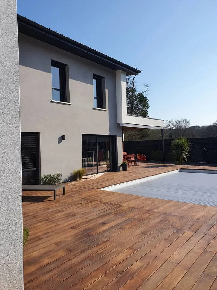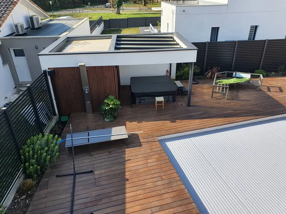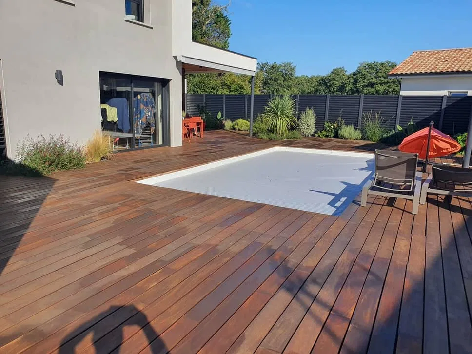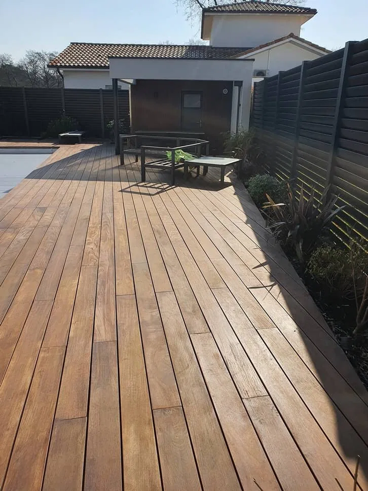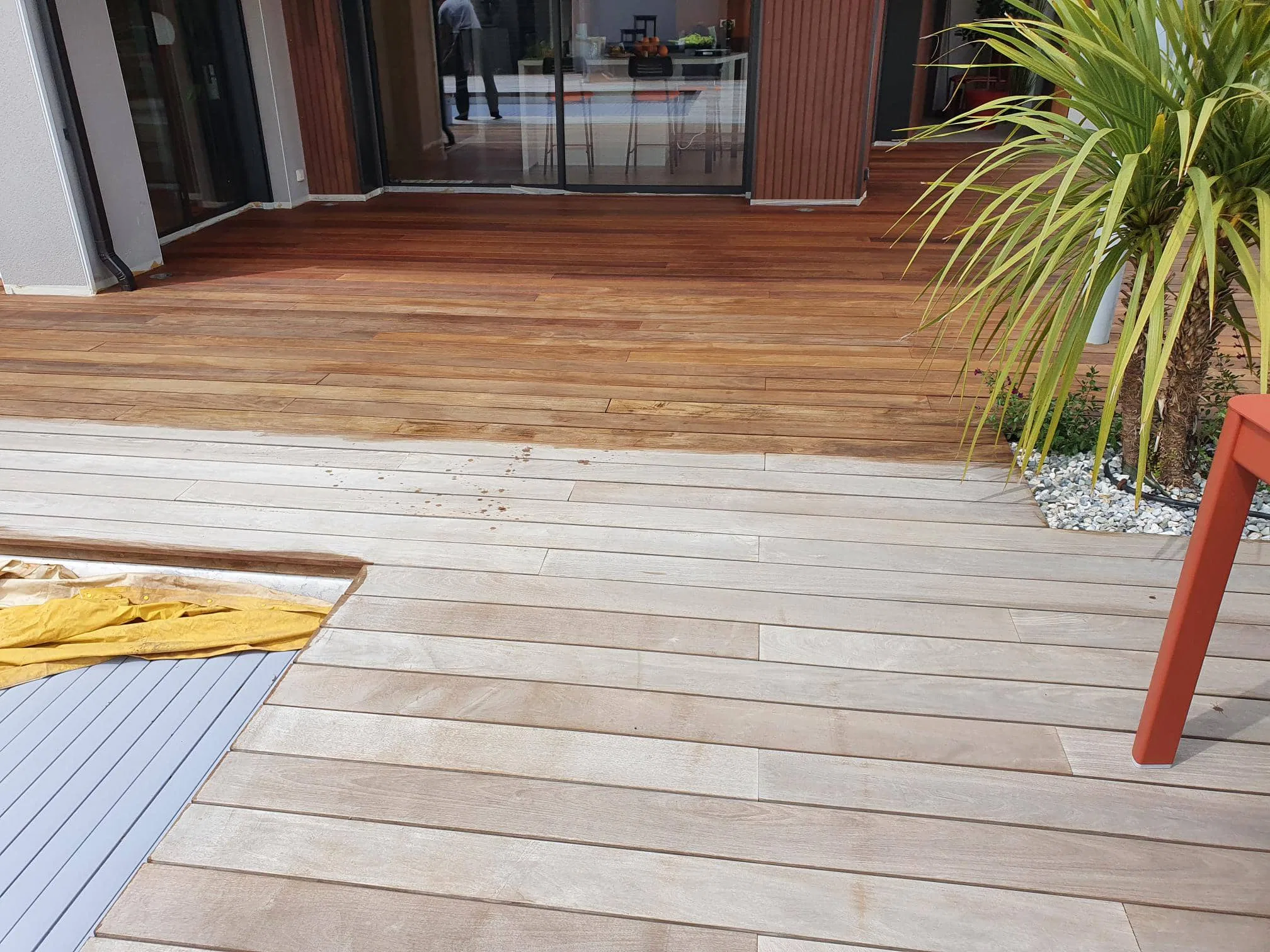 Fourniture et pose de caillebotis en Ipé. Fixations invisibles + saturation de l’ensemble.